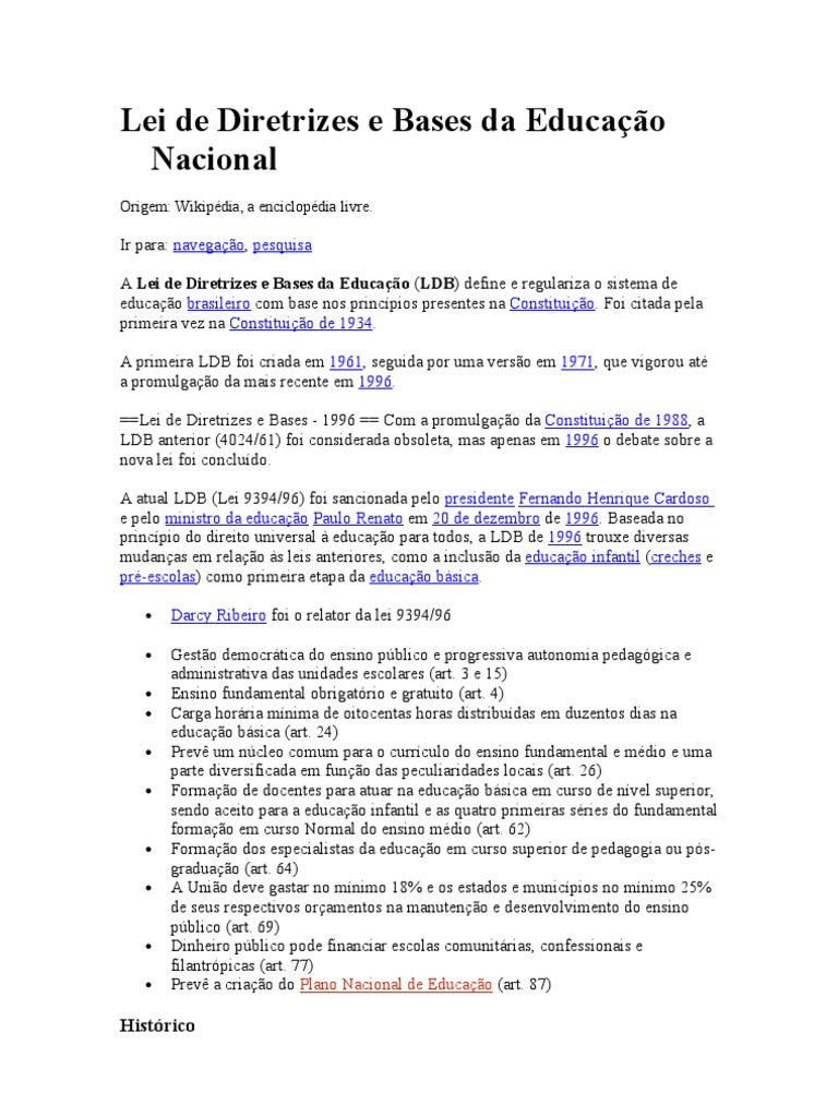 Leis da diretrizes e bases da educação. A lei de diretrizes e bases da educação nacional ldb representa um grande avanço da educação brasileira daí a importância de conhecermos e analisarmos este temaquestões sobre ldb lei de diretrizes e bases da educação nacionala ldb define e reg. Ldb lei de diretrizes e bases da educação com o professor carlinhos costa gran cursos online concursos públicos. O presidente da república faço saber que o congresso nacional decreta e eu sanciono a seguinte lei. Você pode solicitar no site do senado o livro físico ou baixar o pdf. Esta lei estabelece as diretrizes e bases da educação nacional. 0 lei no 9394 de 20 de dezembro de 1996 1 estabelece as diretrizes e bases da educação nacional. A professora márcia gil apresenta a primeira aula de lei de diretrizes e bases da educação nacional super professores. Download da ldb atualizada a lei no 93941996 ldb é leitura obrigatória para todos os profissionais da área da educação bem como todos os estudantes de pedagogia. Vii oferta de educação escolar regular para jovens e adultos com características e modalidades adequadas às suas necessidades e disponibi. 1º a educação abrange os processos formativos que se desenvolvem na vida familiar na convivência humana no trabalho nas instituições de ensino e. Lei de diretrizes e bases da educação nacional.