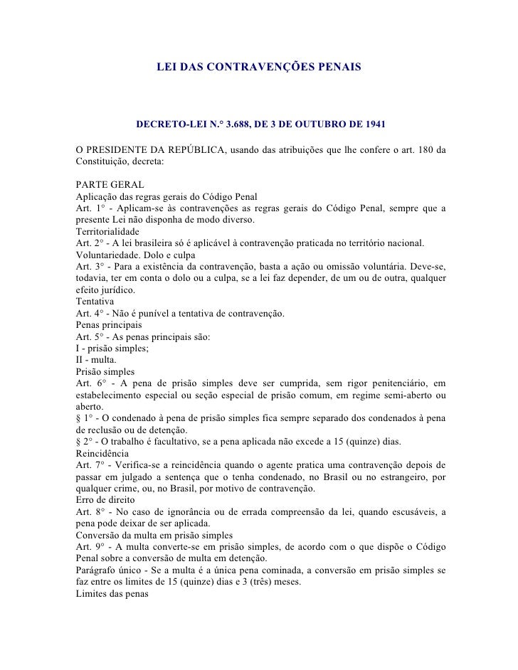 Lei das contravenções penais. Decreto lei n 3688 de 3 de outubro de 1941 lei das contravenções penais lei das contravenções penais. Lei das contravenções penais. O presidente da república usando das atribuições que lhe confere o art. Leiam 24 não leiam. 120º da independência e 53º da república. Aumenta se a pena de 13 um terço até a metade se a vítima é maior de 60 sessenta anos. Decreto lei nº 3688 de 3 de outubro de 1941 lei das contravenções penais. Perturbar alguem o trabalho ou o sossego alheios.