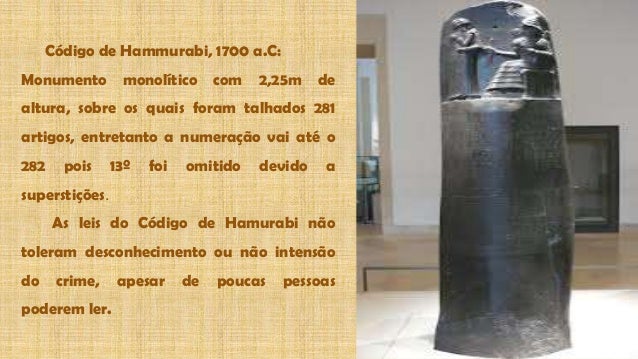 Todas as leis do codigo de hamurabi. Estas leis mais exatamente um conjunto de decisões judiciais editadas ou validadas por hamurabi poderiam ser considerados apenas como um dispositivo de jurisprudência já que o texto é herdeiro de uma tradição que teve início a partir do fim do terceiro milênio ac transmitida verbalmente ao longo do tempo na região da mesopotâmia. Seu texto contendo 282 princípios foi reencontrado em susa 1901 1902 por uma delegação francesa na pérsia sob a direção de jacques de morgan sob as ruínas da acrópole de susa e transportado para o museu do louvre. Resumo o código de hamurabi foi talhado numa grande rocha de diorito de 225 metros de altura 160 metros de circunferência na parte superior e 190 metros na base. O código de hamurabi estabelecia regras de vida e de propriedade estendendo a lei a todos os súditos do império. Ela foi impressa num bloco de rocha utilizando a escrita cuneiforme. As leis do hamurabi são tão imotantes que nelas existem artigos como a lei do aborto de crimes hediondo cometido de forma premeditado proteção a família lei contra a escravidão leis do campo que regulamentava o direito a propriedade privada etc. O código é baseado na lei de talião olho por olho dente por dente. A continuación os presento el texto del código de hammurabi viene de un post anterior donde se explica qué es el código de hammurabi parte i. O código de hamurabi é um conjunto de leis criadas na mesopotâmia por volta do século xviii ac pelo rei hamurabi da primeira dinastia babilônica. O código de hamurabi é composto de 281 artigos. Si uno ha acusado y ha embrujado a otro y no puede justificarse es pasible de muerte.